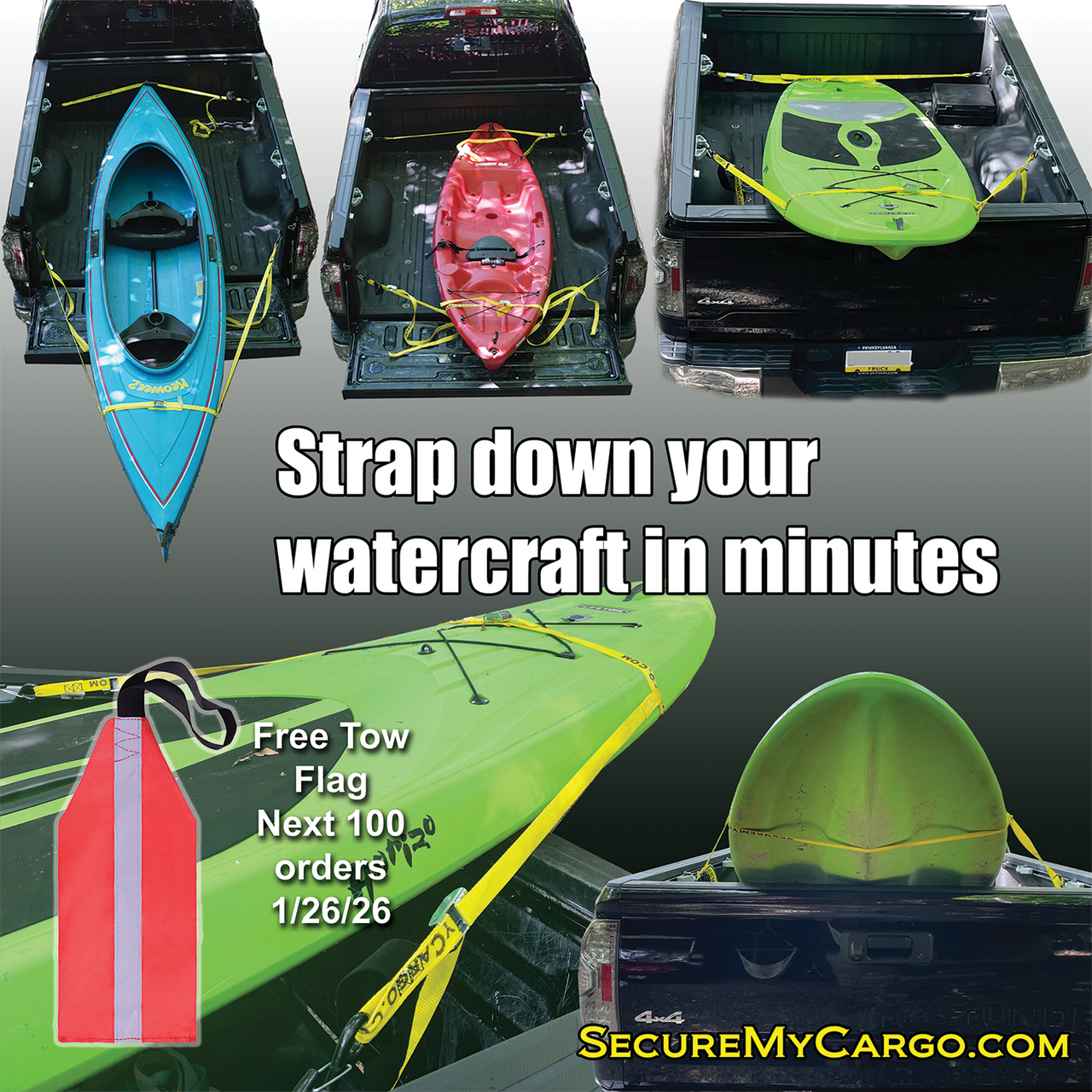 Make strapping your Kayak or Paddleboard super easy and simple when securing it in the back of you pickup truck or van
